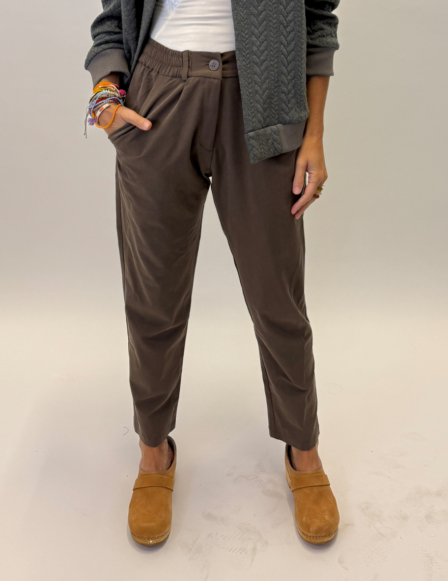 מכנסיים עם פנסים בד טנסל בגוון חום מעושן. גומי במותן, גזרה צרה בקרסול. מידה S