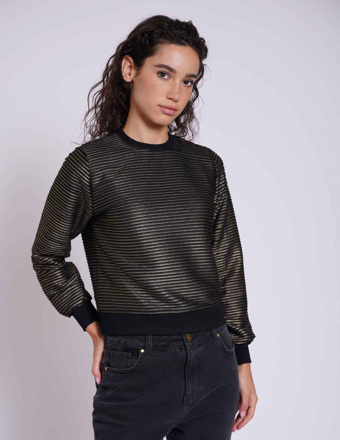 סווטשירט שחור עם פסים מפויל זהב מבד פוליאסטר