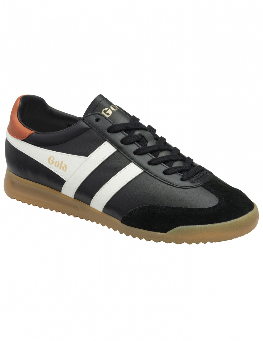 נעלי סניקרס עור שחורות עם עקב בצבע כתום.
