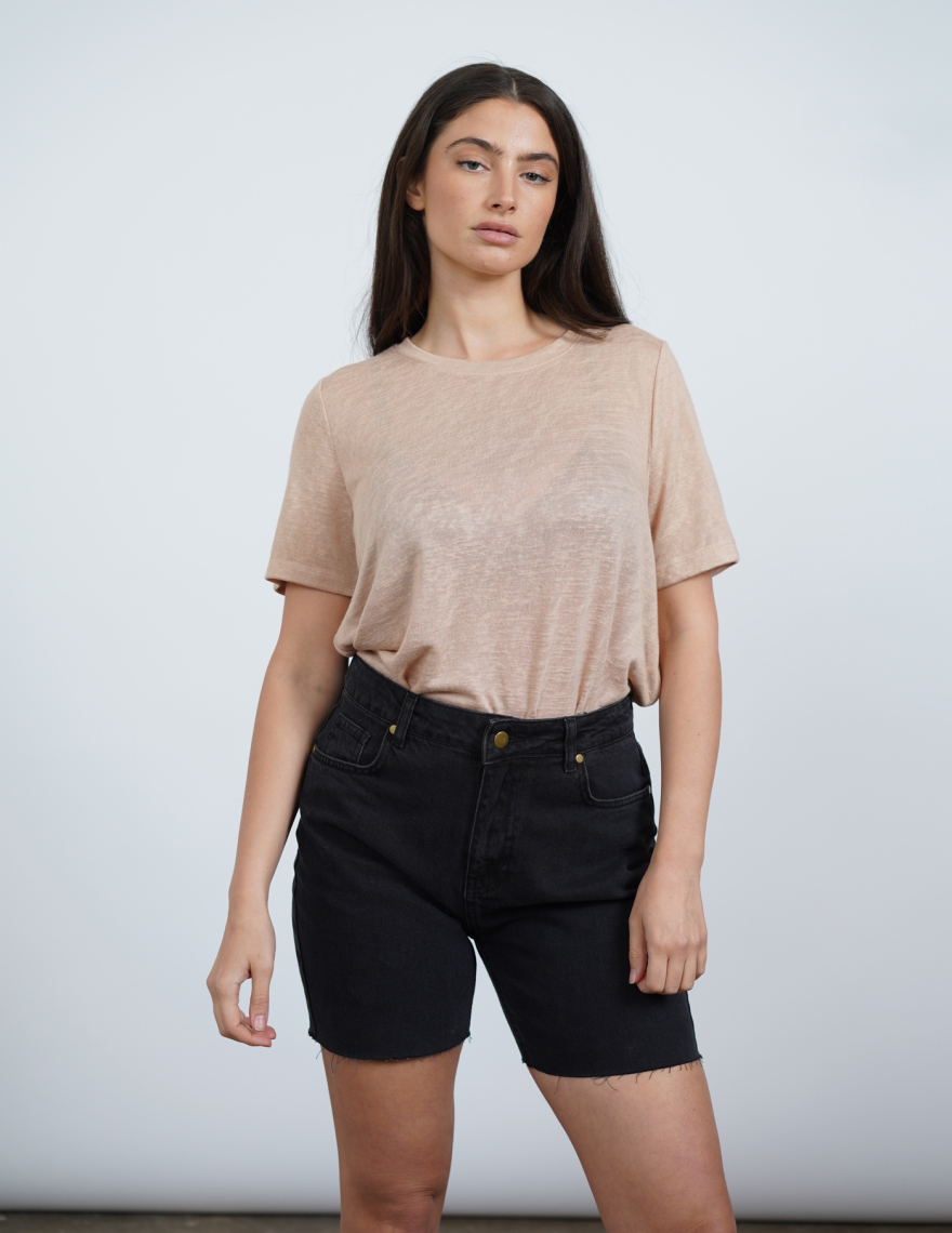 ג’ינס קצר שחור בגזרה מחמאימה בגובה אמצע המותן, עם אורך מדוייק שמעניק תחושה קיצית ונוחה – לא קצר מדי ולא ארוך מדי.