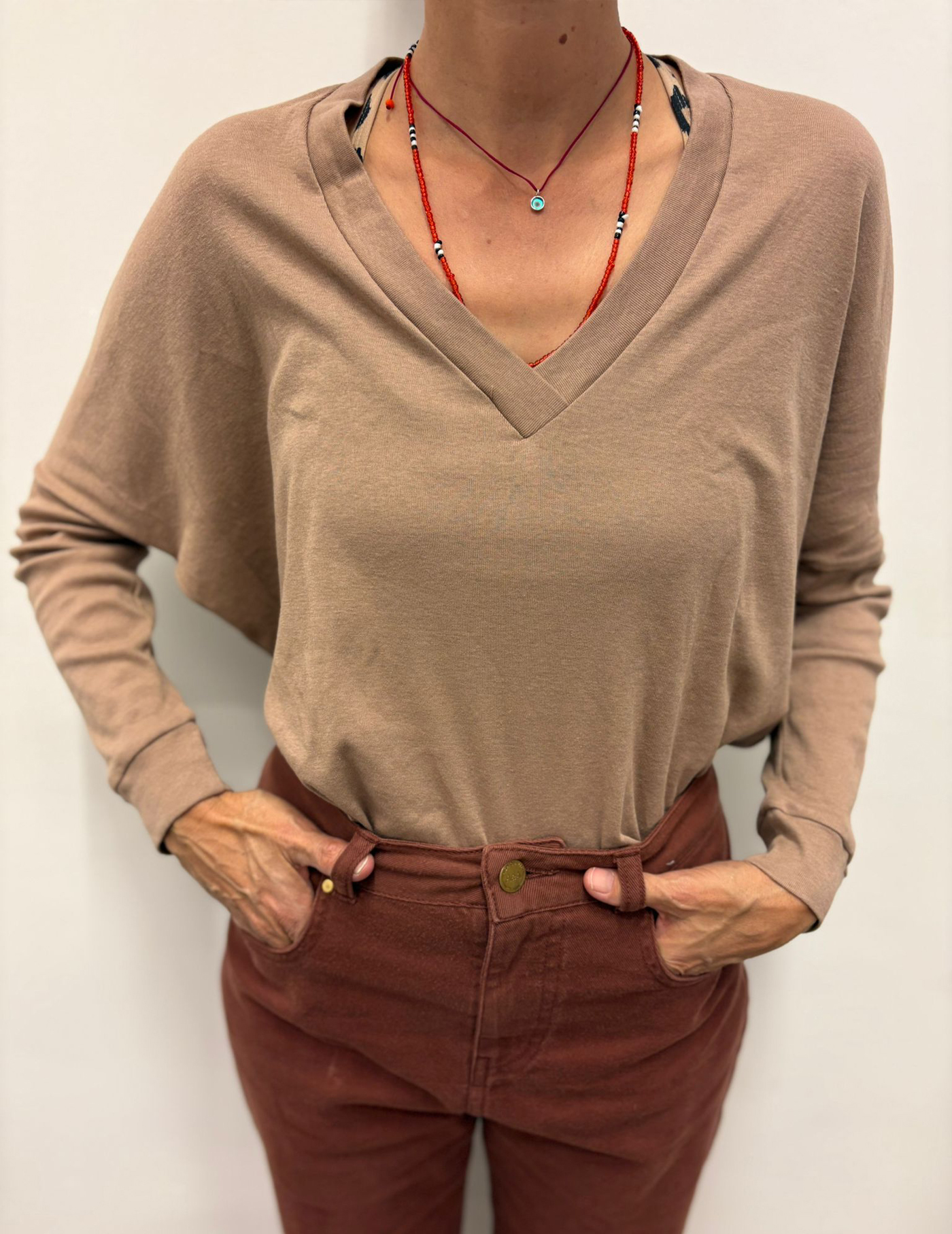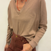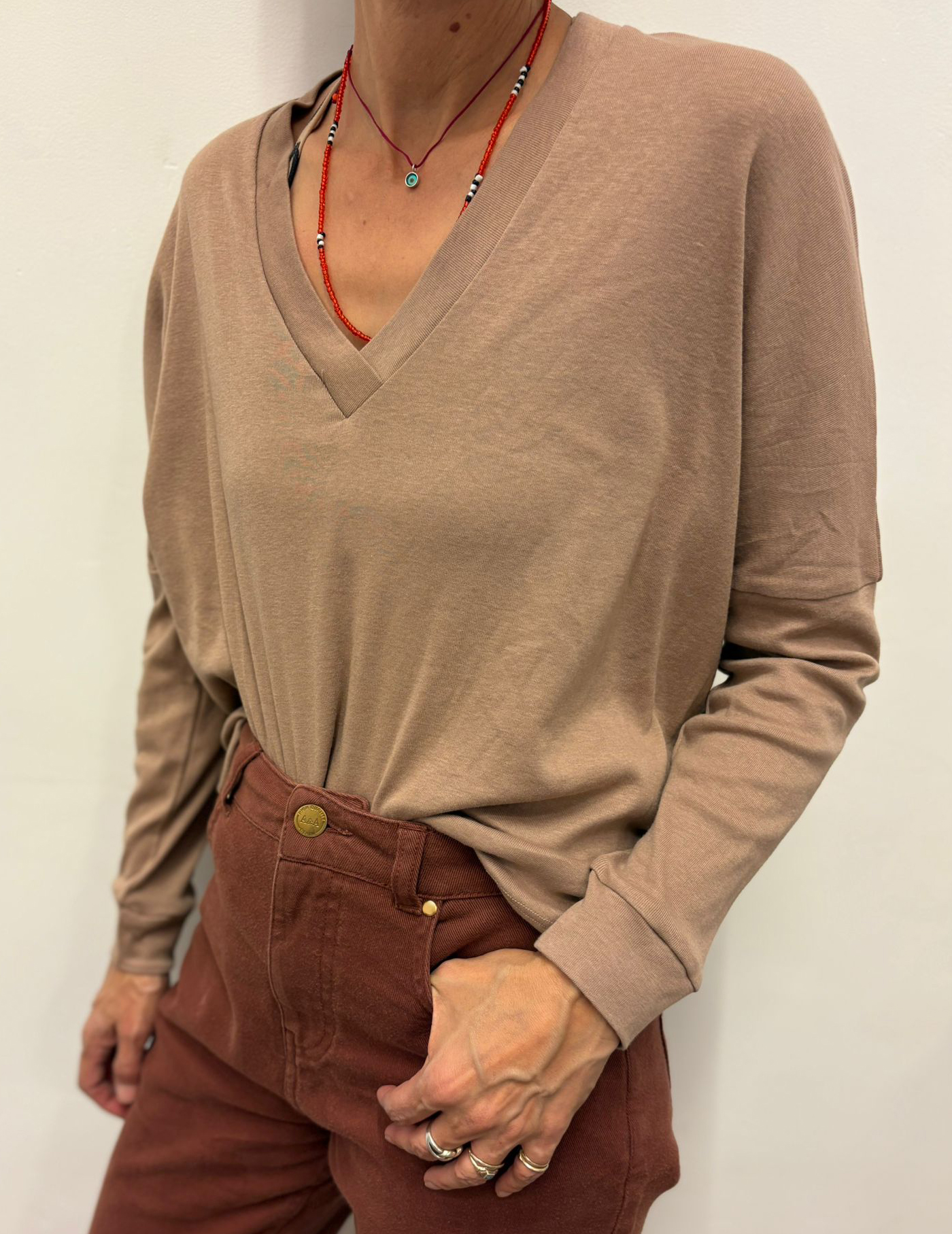 חולצת וי עם שרוול ארוך בגימור מנג’ט עד שורש כף היד.