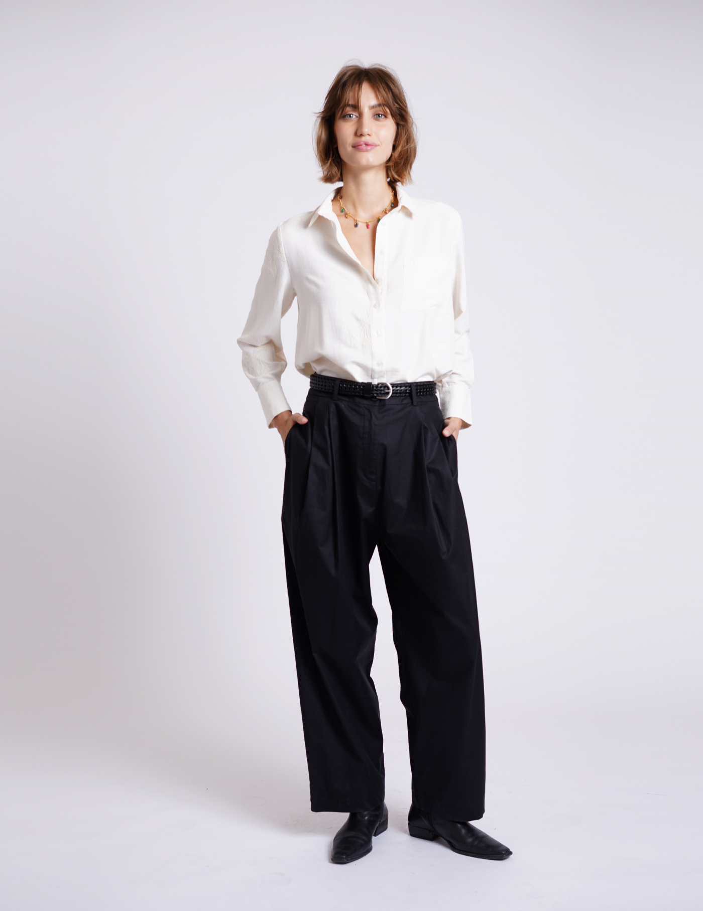 מכנסיים מחוייטים בגזרת בלון עם פנסים מקדימה, מחוייט בגזרה מחמיאה וצמודה במותן. מתרחבת בהדרגה לגזרת בלון עם פנסים וכיסים לנוחות מירבית.