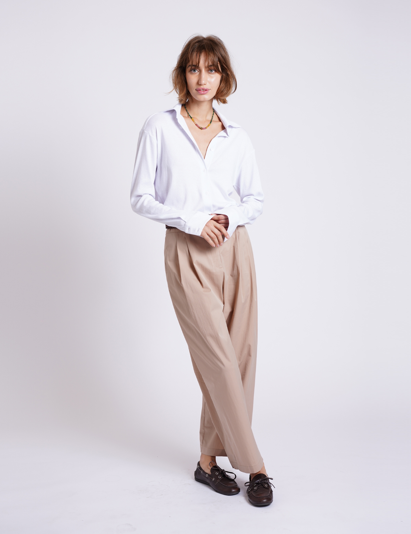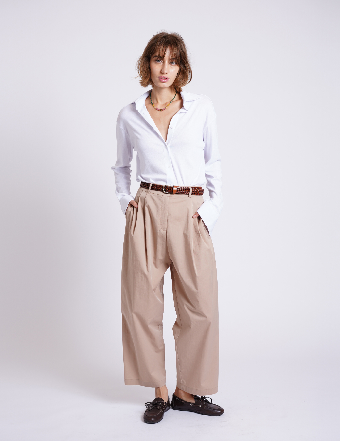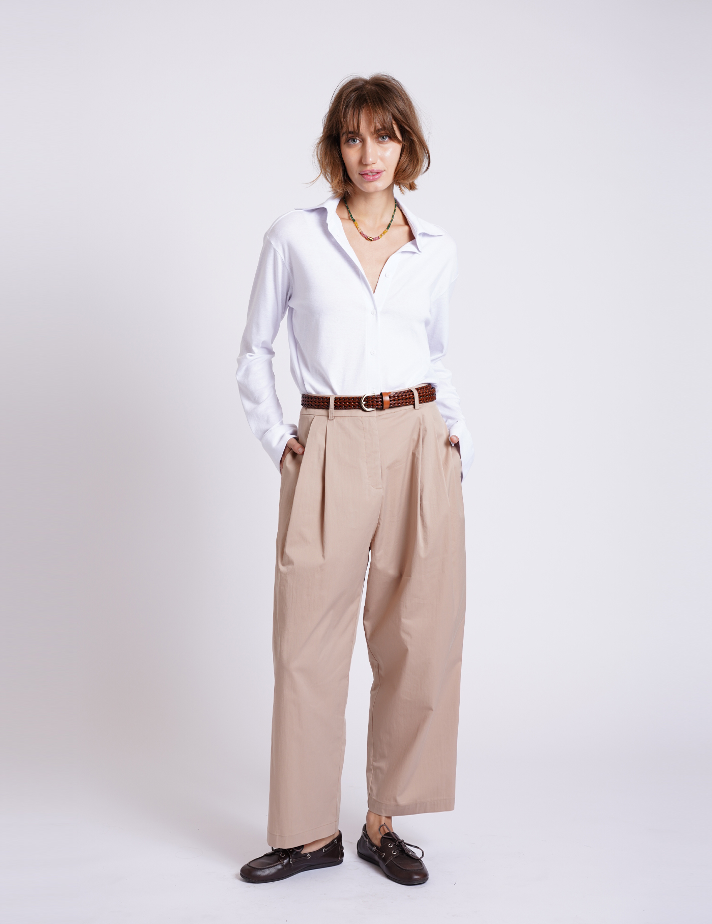 שלבי אותם עם חגורה ומוקסינים חומים, יחד עם טי שירט בצבע טבעי, ליצירת לוק מתוחכם ואלגנטי.